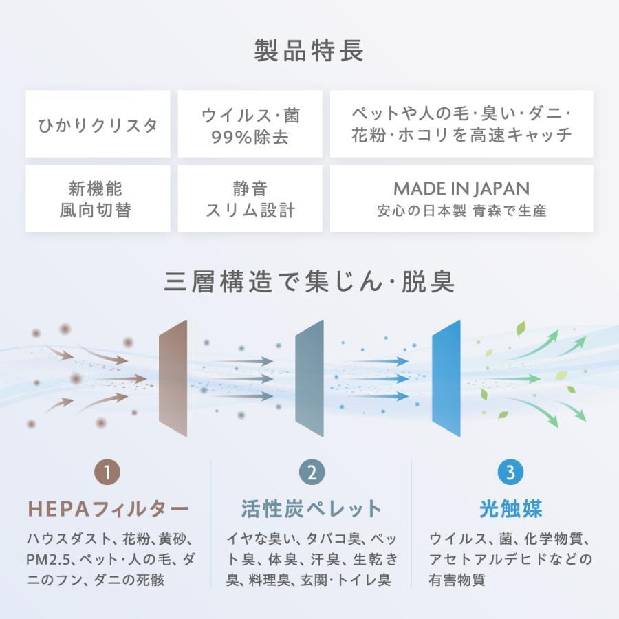 花粉、ハウスダストなどの大きな浮遊物と臭いはHEPAフィルター&活性炭フィルターで除去しフィルターを通過した浮遊菌や浮遊ウイルスは「ひかりクリスタ(光触媒)」で吸着分解。