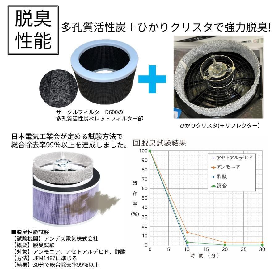 ・脱臭方式:ひかりクリスタ(酸化チタン光触媒)+多孔質活性炭ペレット(サークルフィルターD600)